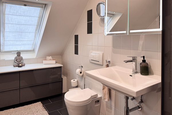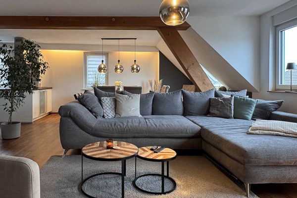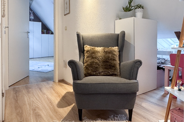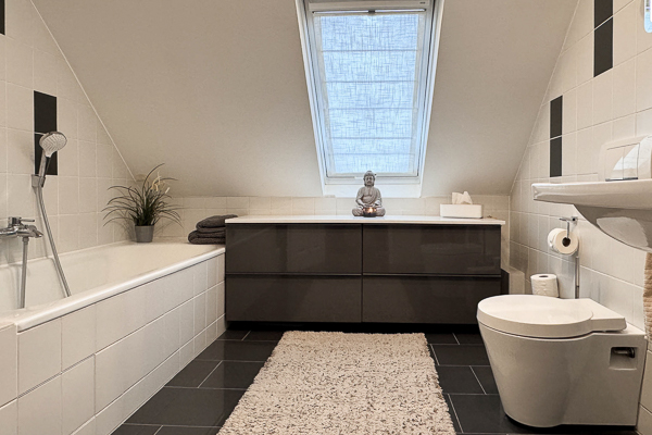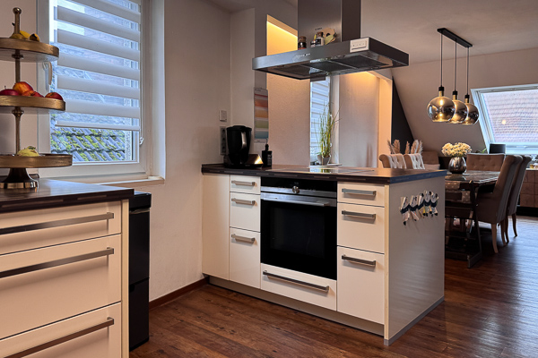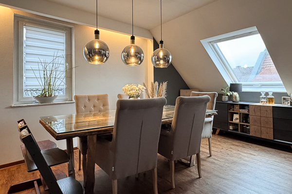 Die Wohnung ist in allen Wohnräumen mit einem hochwertigen Vinylboden in Eichenoptik ausgestattet, das Badezimmer präsentiert sich modern und geschmackvoll gefliest. Wohnzimmer, Bad und Küche verfügen über eine Fußbodenheizung, die bequem per App steuerbar ist. In den vergangenen Jahren wurde die Wohnung fortlaufend renoviert und modernisiert: Teilweise wurden Fenster durch 3-fach verglaste Elemente ersetzt, die Dachfenster erneuert und mit elektrisch steuerbaren Velux-Rollos ausgestattet. Die ALNO-Einbauküche inklusive neuer Elektrogeräte ist im Kaufpreis enthalten.