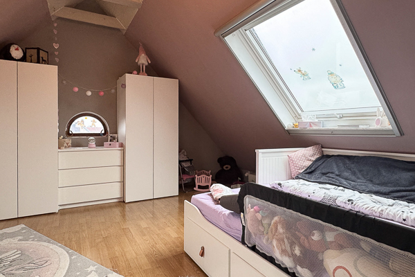 Zur Südseite hin liegt ein weiteres Zimmer mit vollständig zu öffnender, bodentiefer Fensterfront und Zugang zur schönen Loggia, auf der sich der Abend entspannt ausklingen lässt. Über eine Treppe gelangen Sie in das Dachgeschoss, das zusätzliche ca. 30 m² Fläche zur individuellen Nutzung bietet.