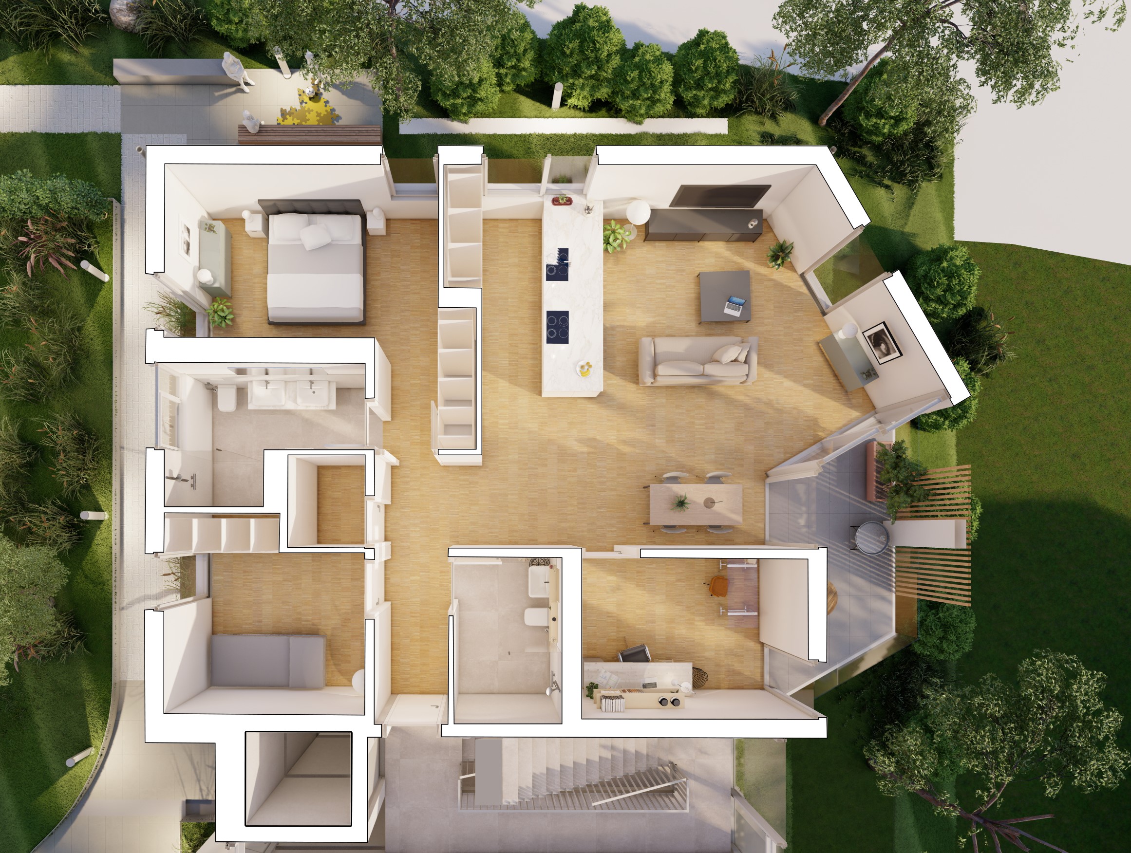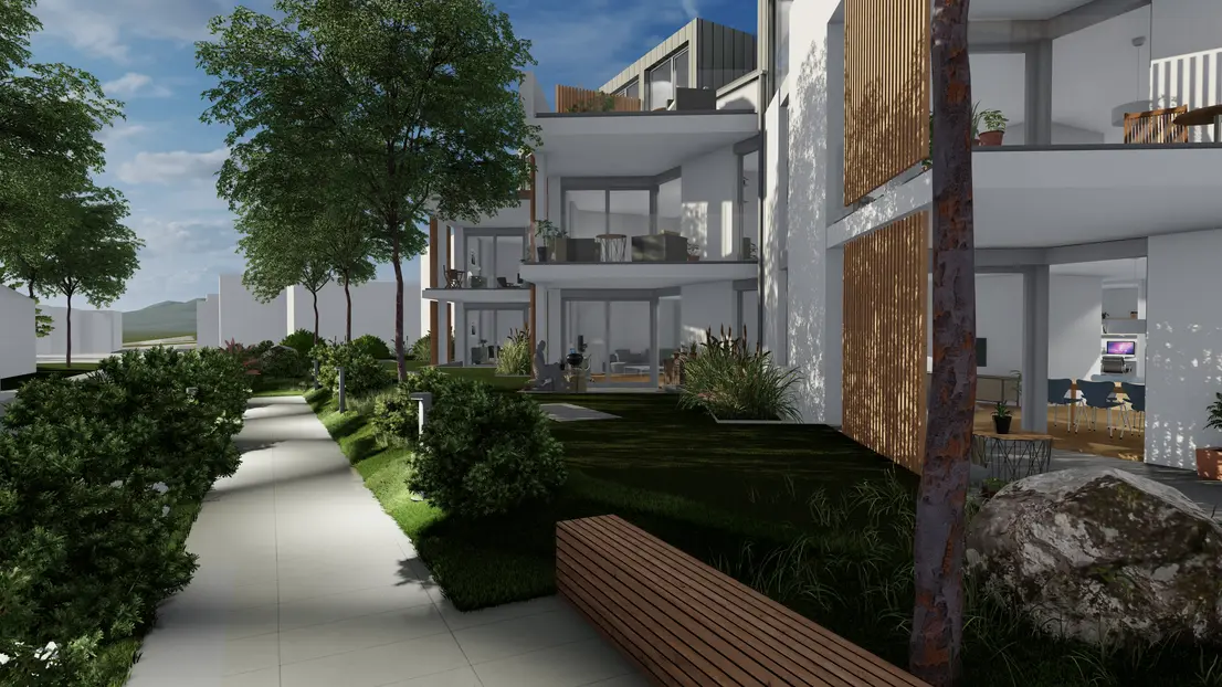 Der Neubau wird in eine intensiv begrünte Freianlage eingebettet.