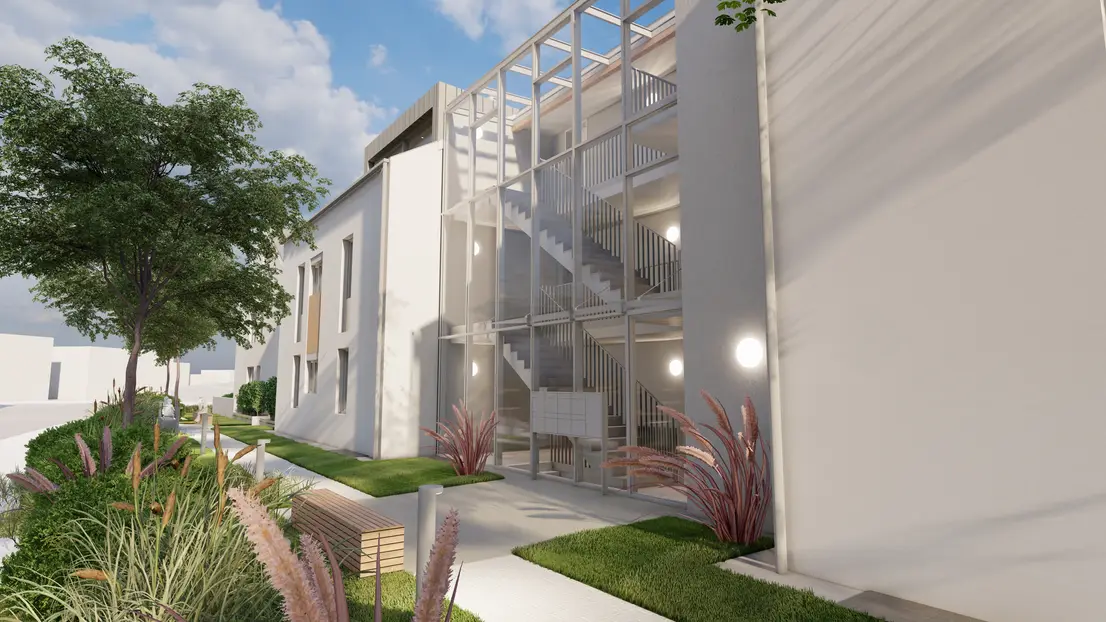 Der Neubau wird in eine intensiv begrünte Freianlage eingebettet.
