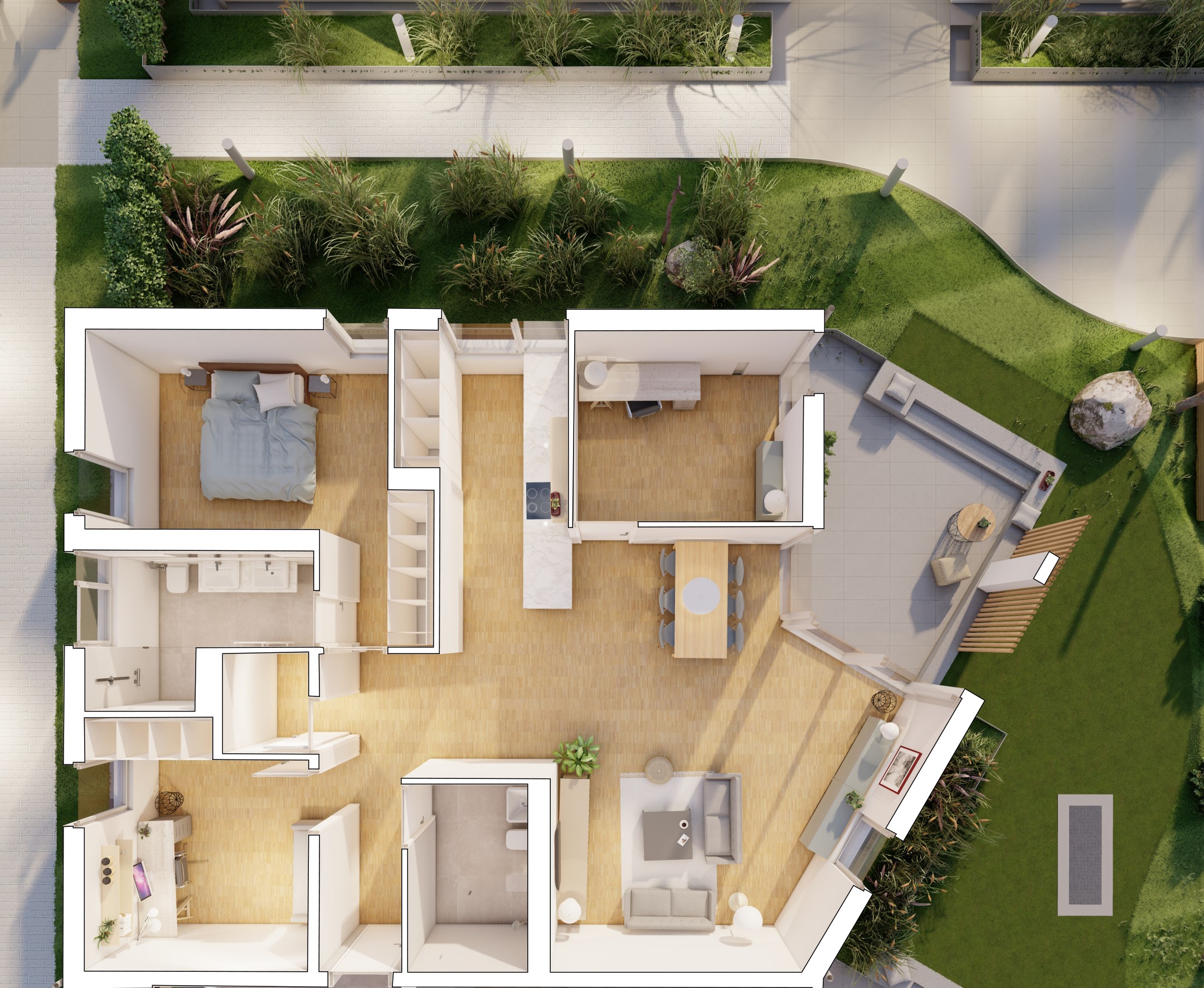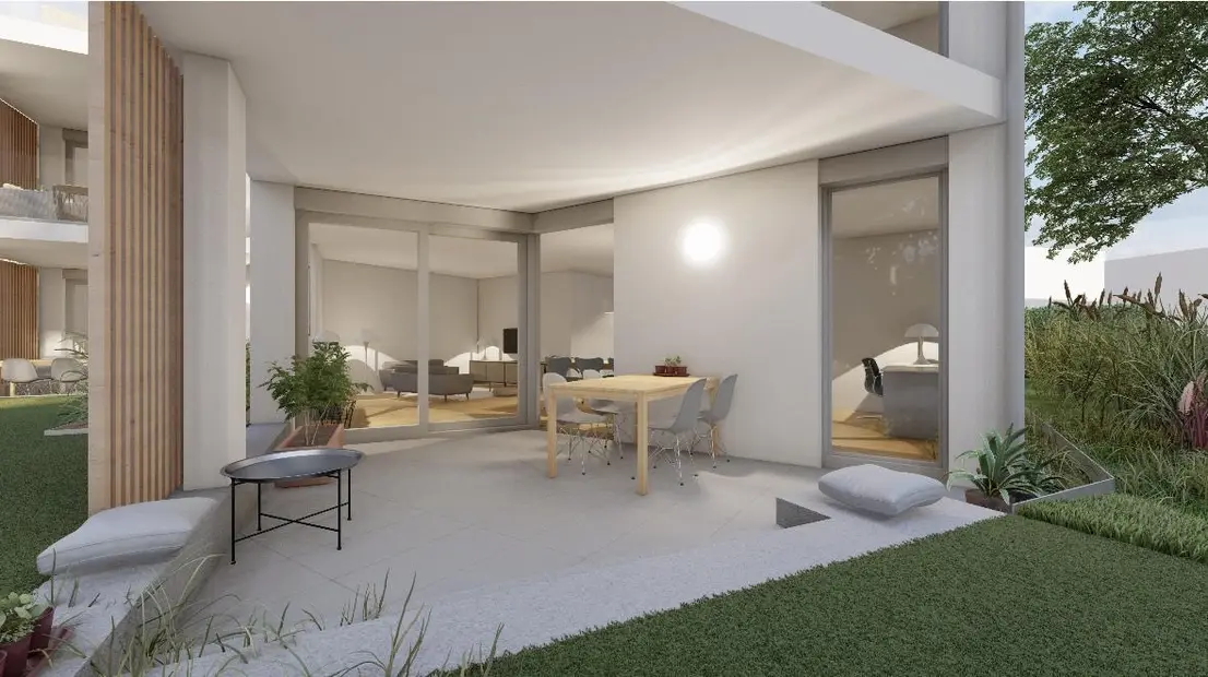 Die Gartengeschosswohnung verfügt über ca. 120 m² Wohnfläche, aufgeteilt auf 4 Zimmer. Das große und offene Wohn-Esszimmer mit integrierter Küche ist der Mittelpunkt der Wohnung. Zwei helle Schlafzimmer eignen sind ideal als Büro oder Gästezimmer. Ein separater Elternbereich mit Schlafzimmer, Ankleidebereich und Badezimmer en suite bietet zudem viel Privatsphäre.